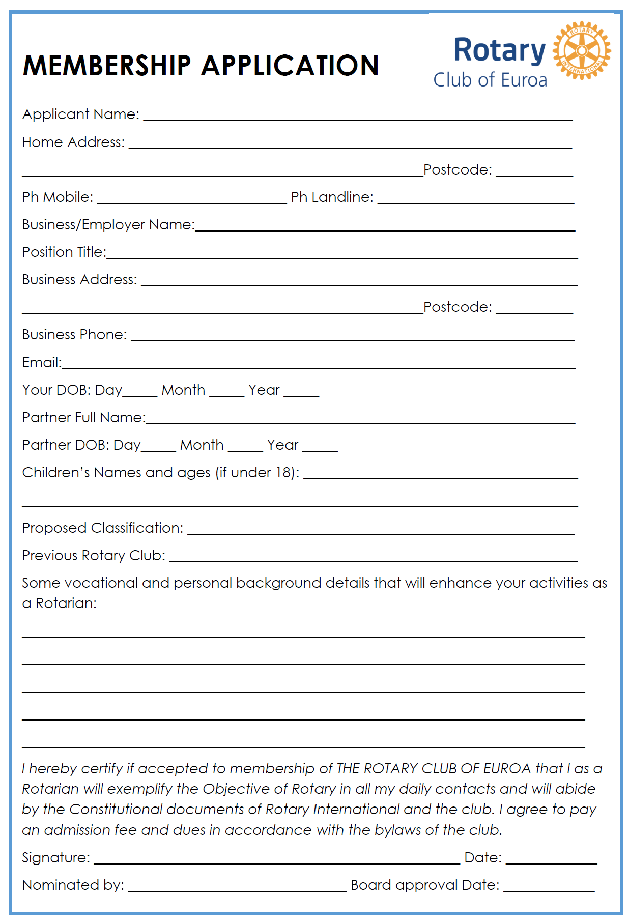 Seven days after members have been advised (and with no objections), a member Application Form needs to be completed and submitted to the Secretary and the new member will be slotted for induction at an upcoming meeting.